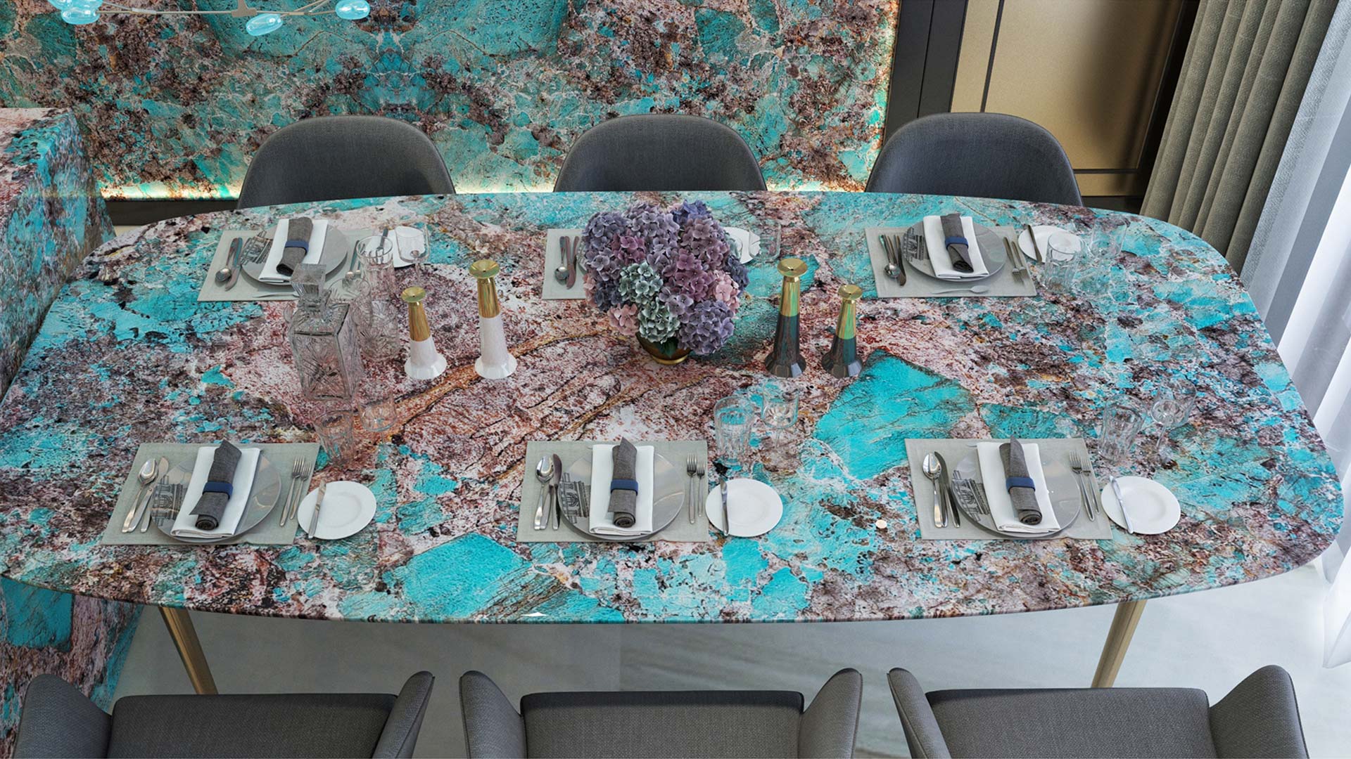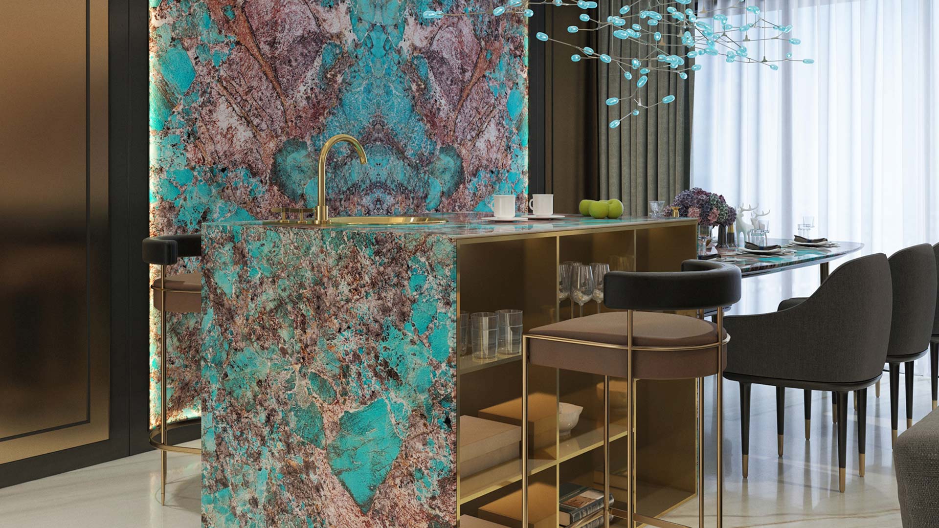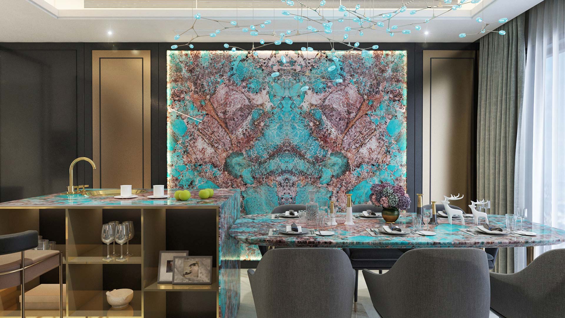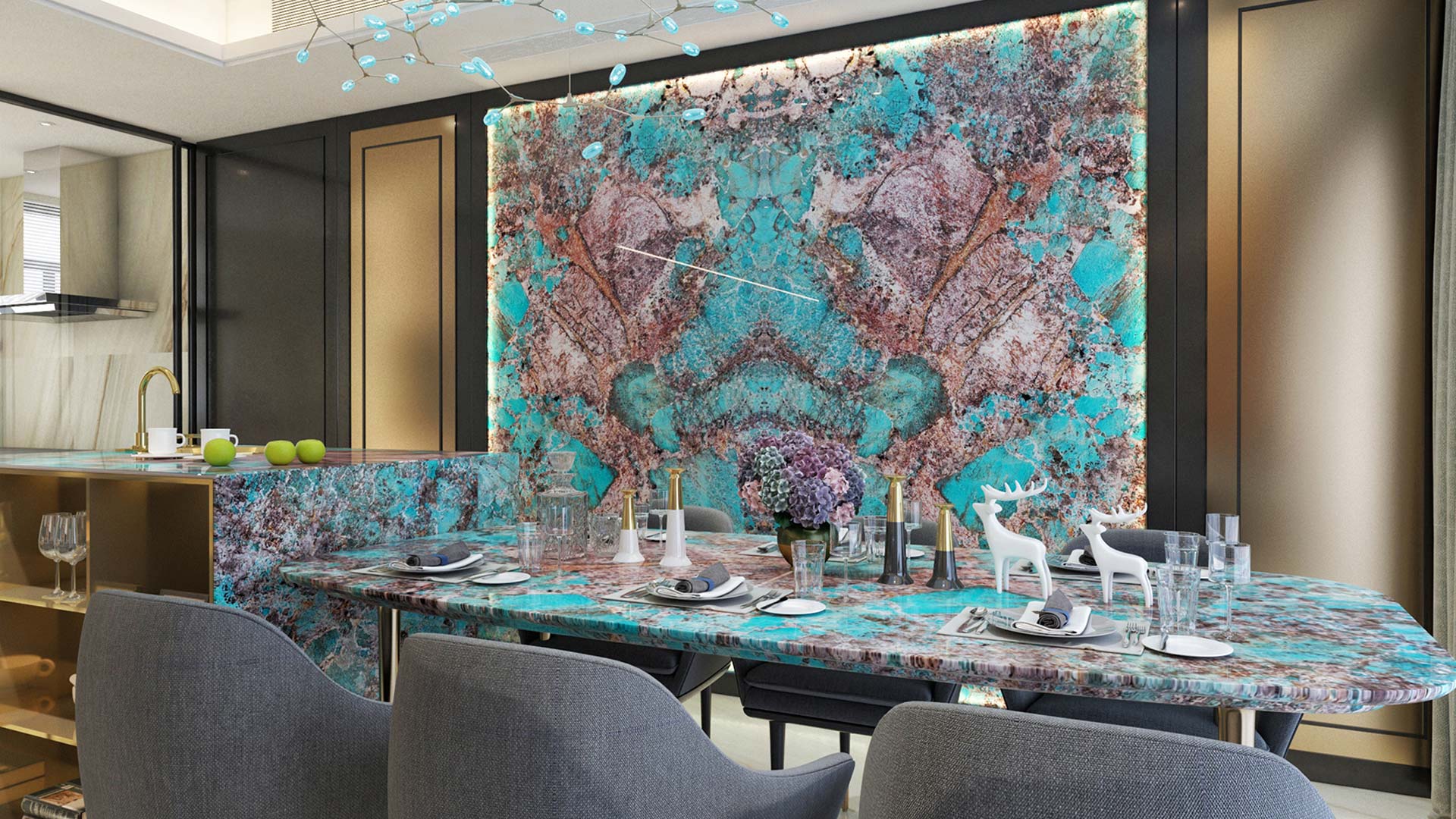 Amazonite (Turquoise) Quartzite is well-suited for wall claddings, TV units, bathroom vanities, feature walls, flooring, and kitchen countertops. Its durability and distinctive appearance make it a preferred option for a range of design projects.