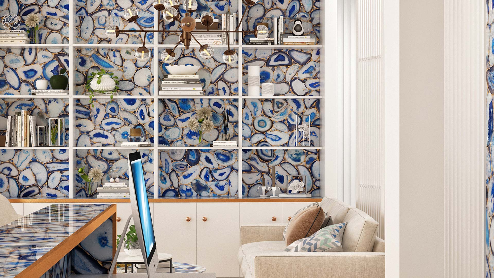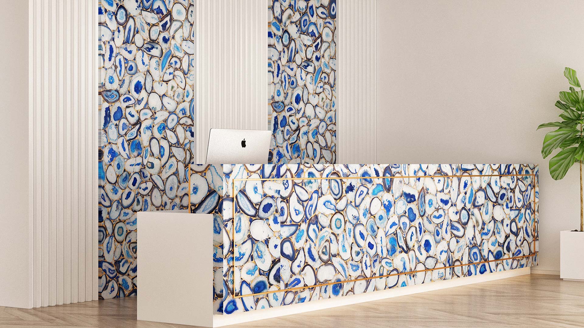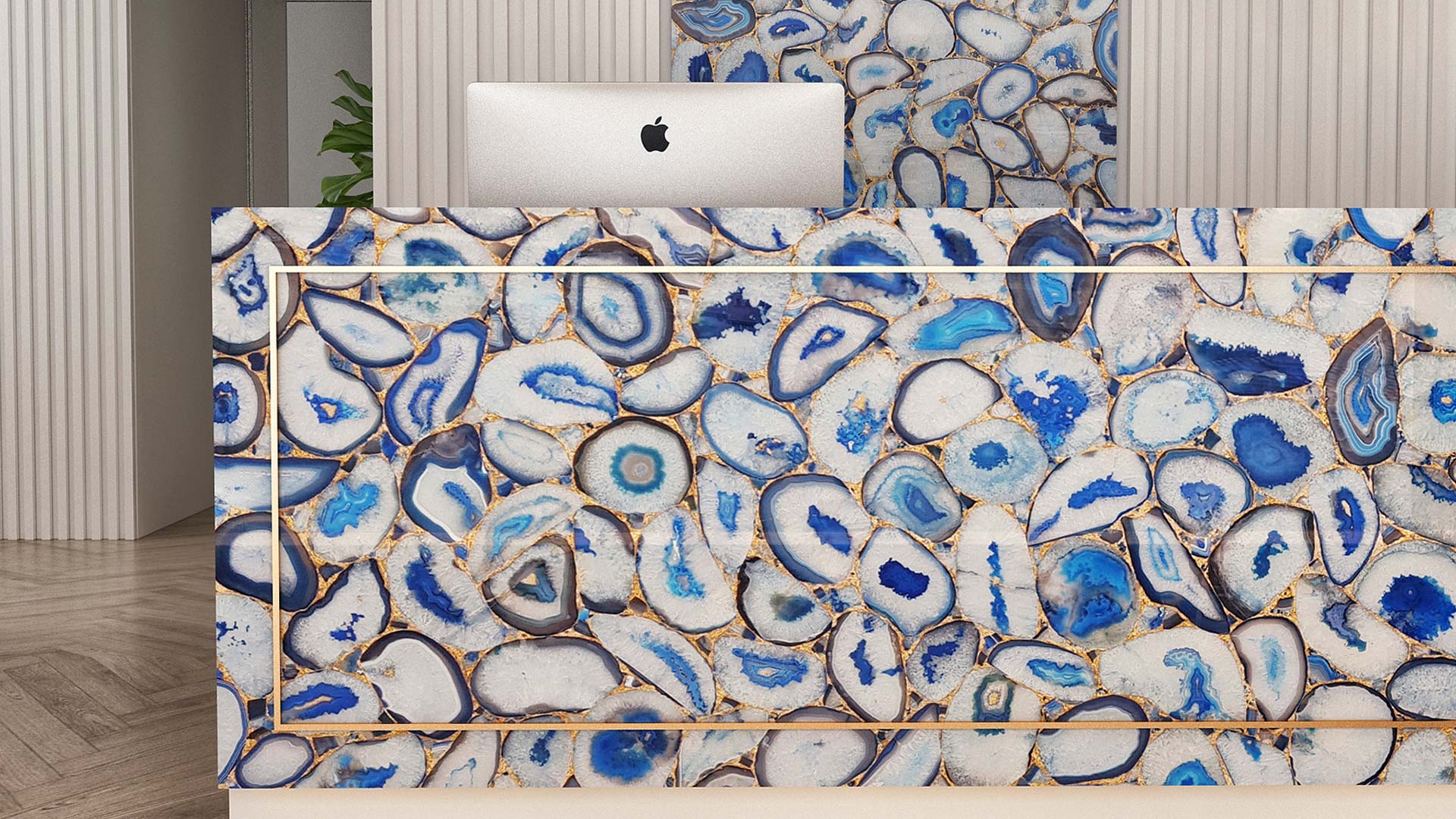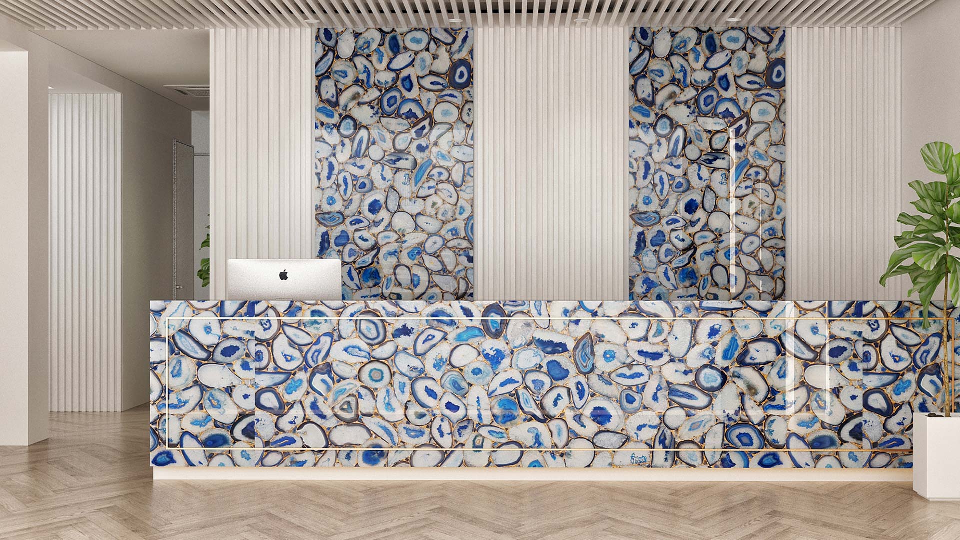 Blue Agate is ideal for wall claddings, TV units, bathroom vanities, feature walls, and decorative panels. Its translucent properties also make it a popular choice for backlit installations, creating a striking visual effect.