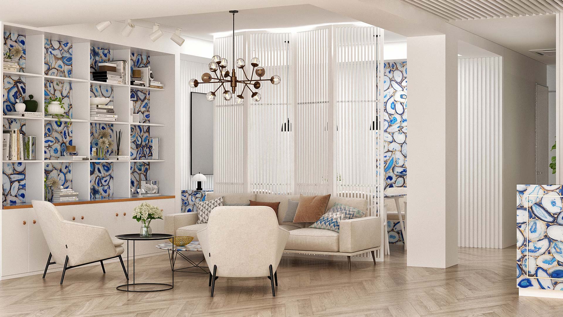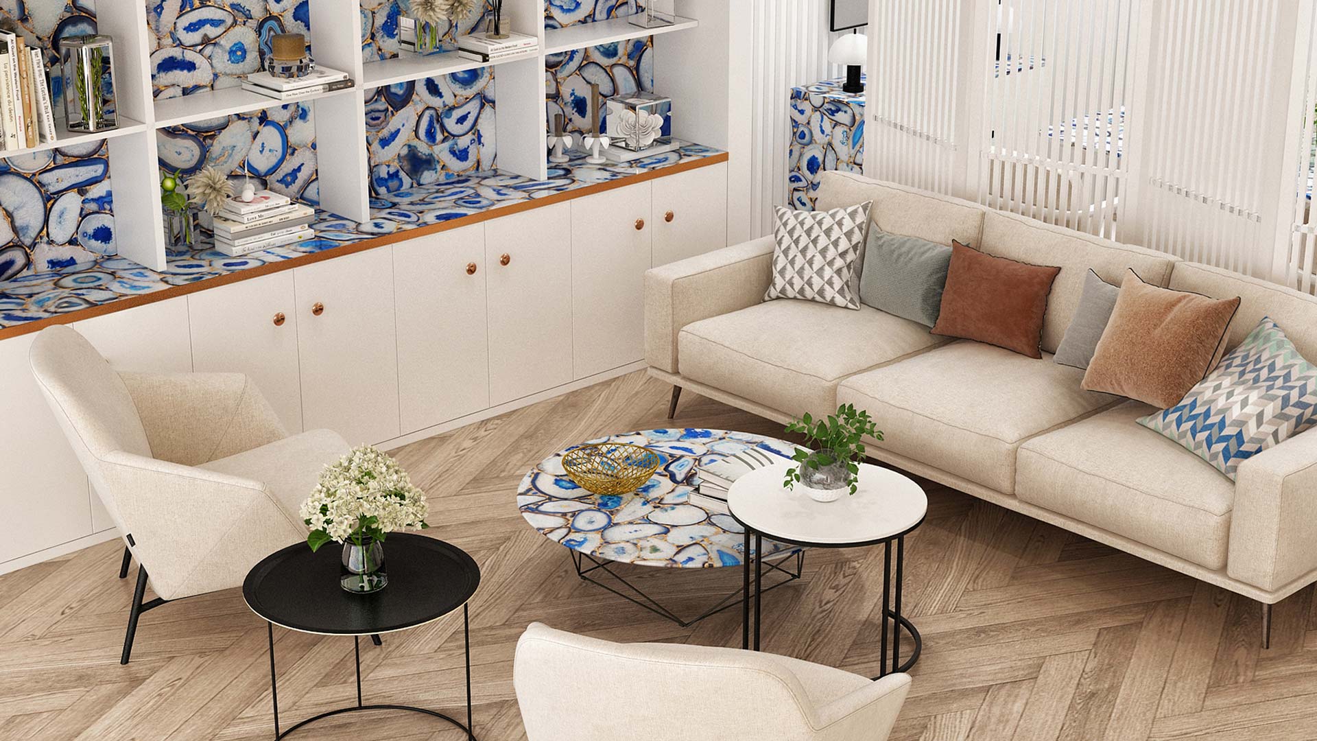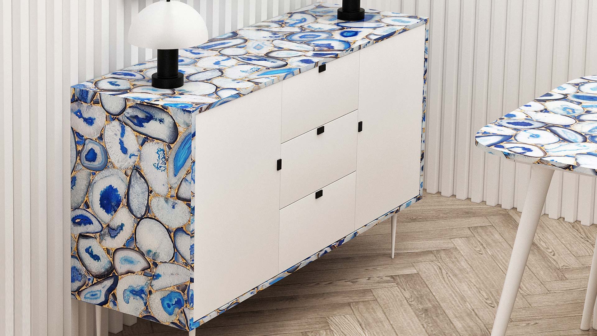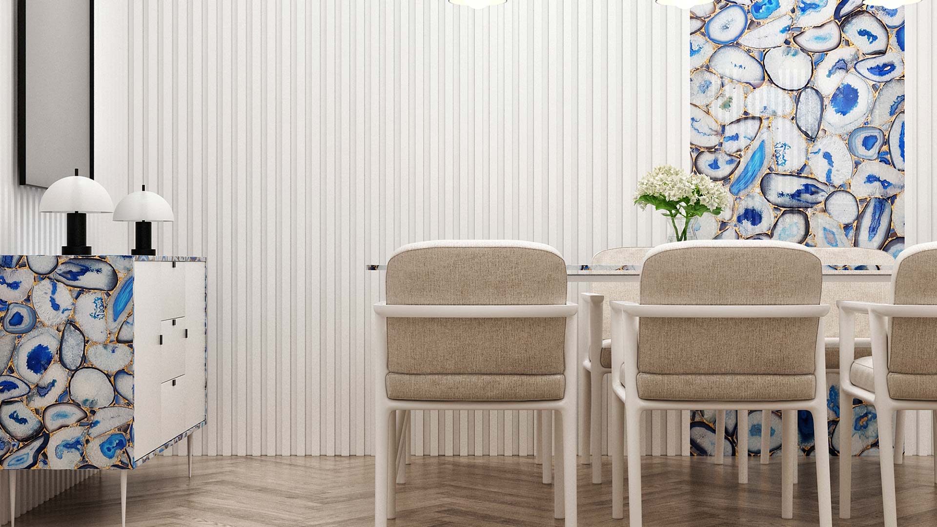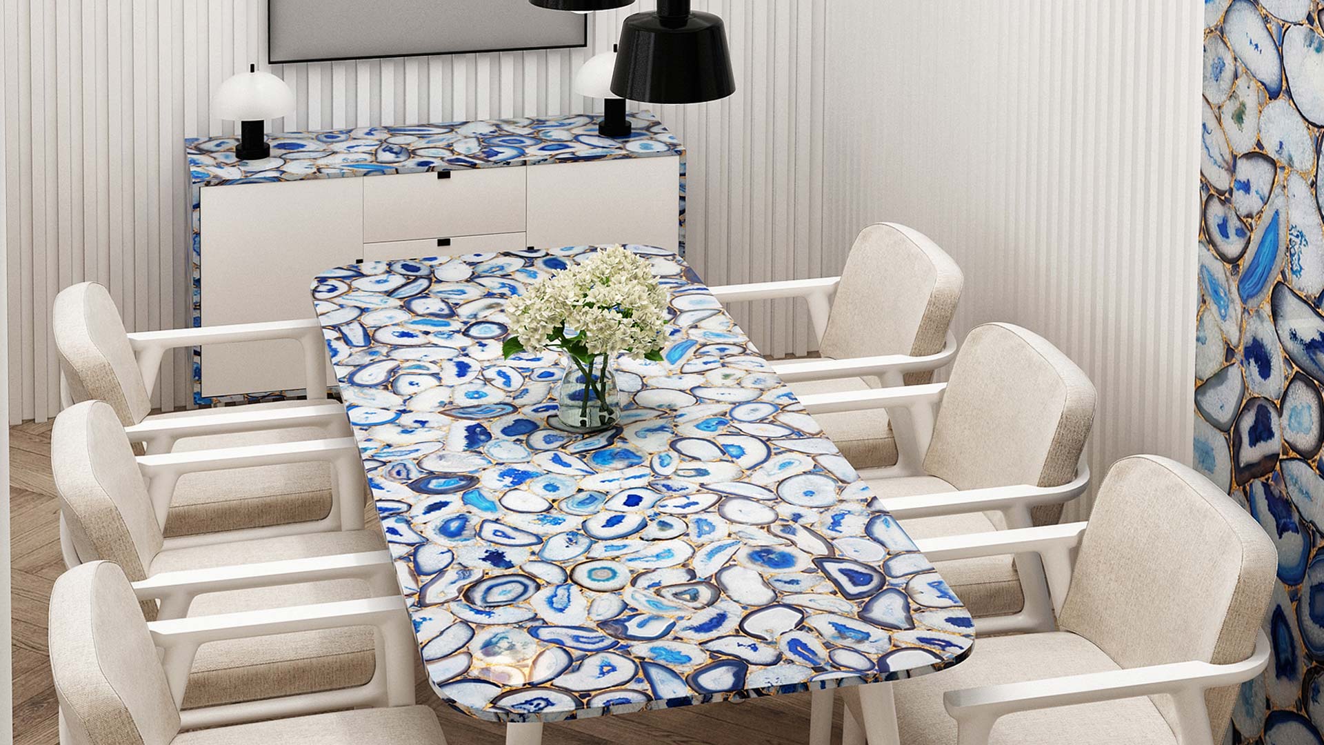 Blue Agate is ideal for wall claddings, TV units, bathroom vanities, feature walls, and decorative panels. Its translucent properties also make it a popular choice for backlit installations, creating a striking visual effect.