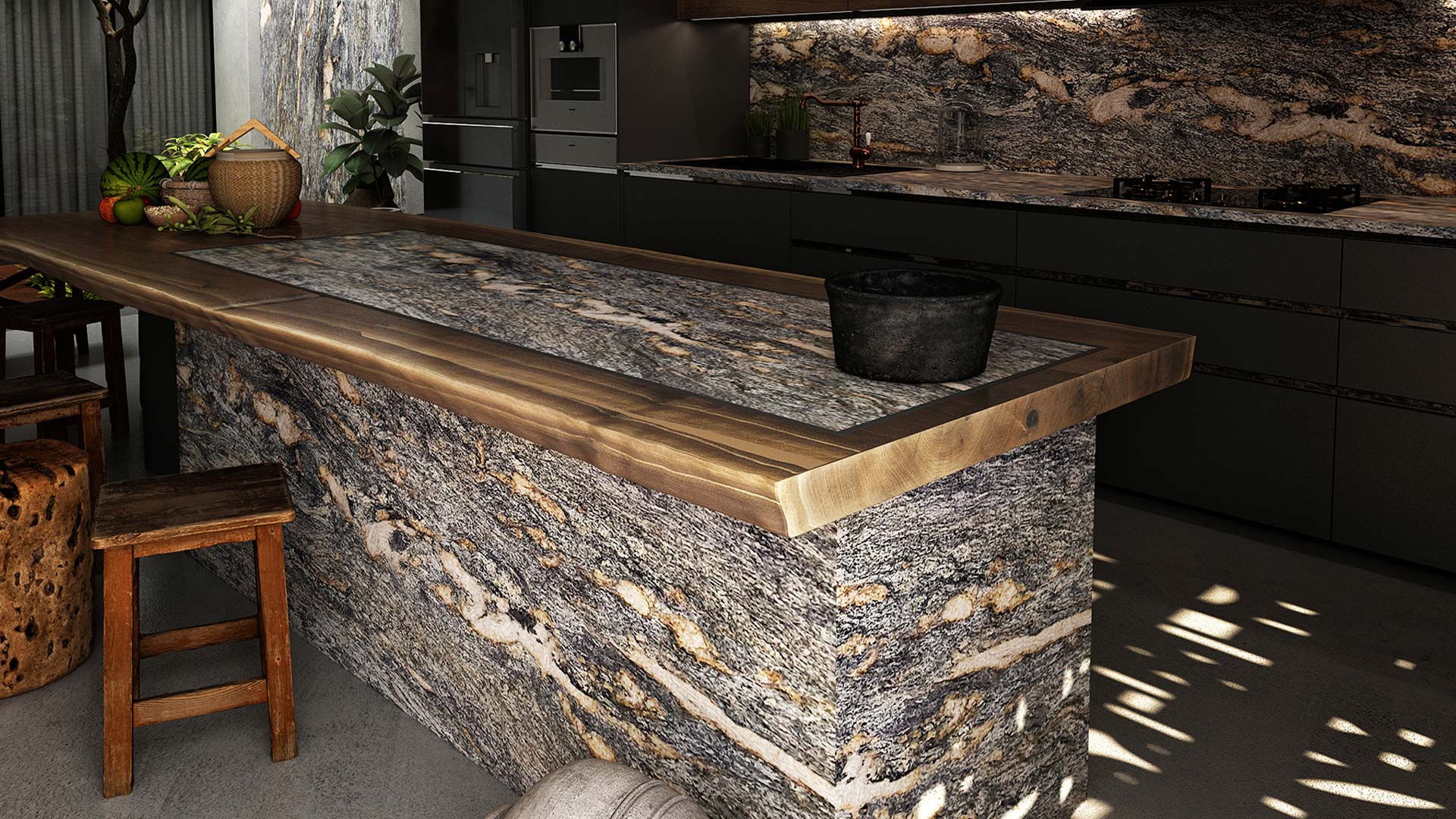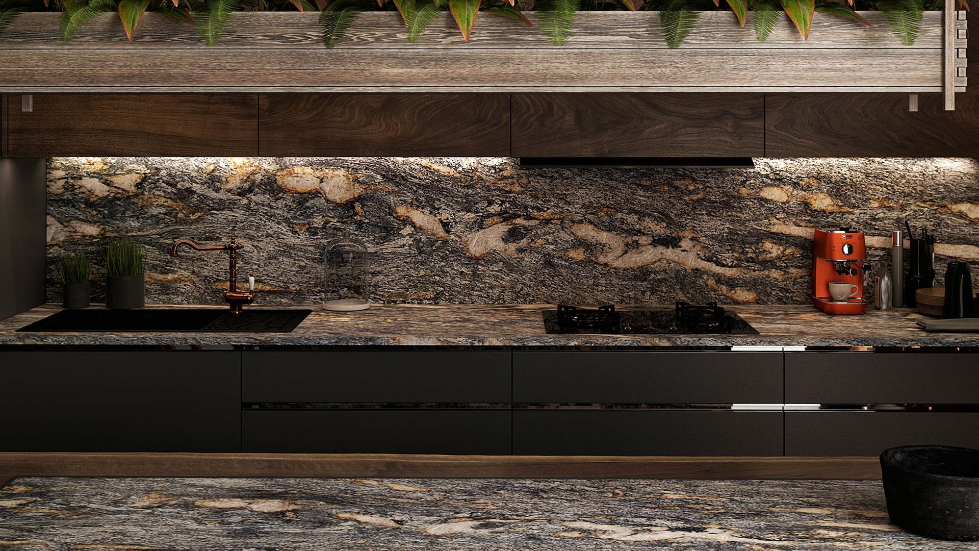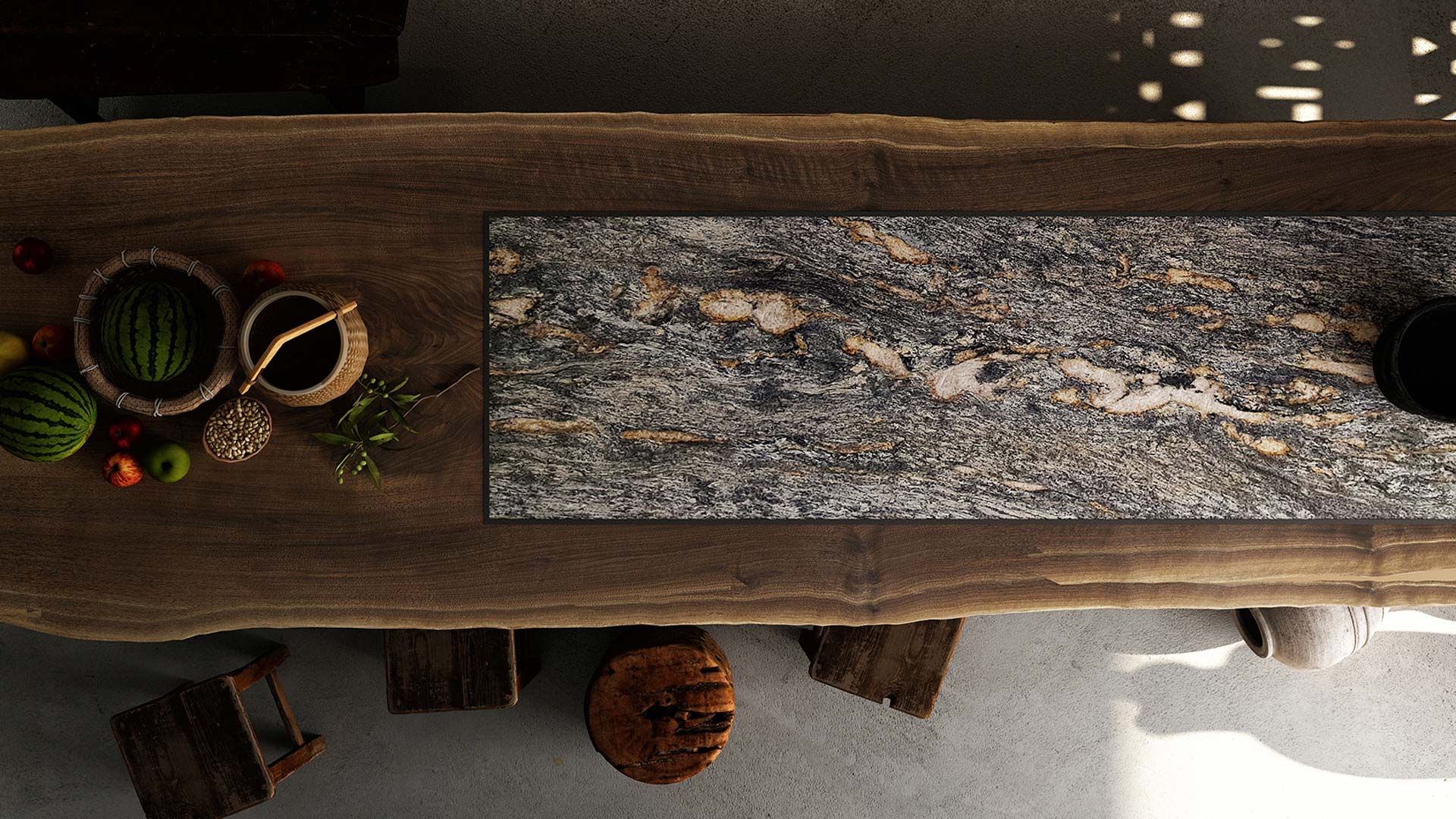 Metalicus Granite is perfect for kitchen countertops, wall claddings, TV units, statement flooring, bathroom vanities, and exterior applications, offering both visual depth and long-lasting durability.